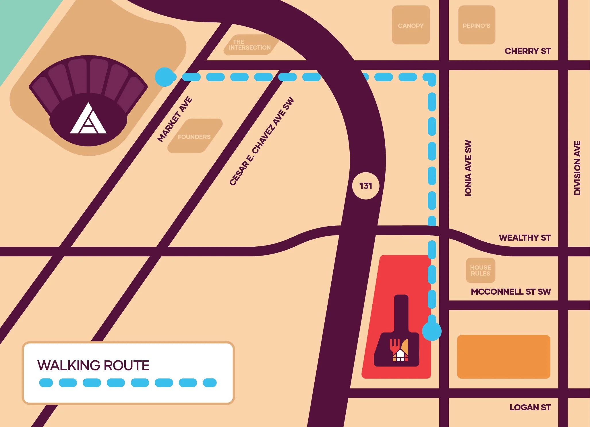 The walking route is very simple! Start at the Downtown Market and head north. Turn left at Cherry Street, go under the 131 bridge and continue west until you reach the amphitheater—it only takes 10-15 minutes (or about 1,200 steps).