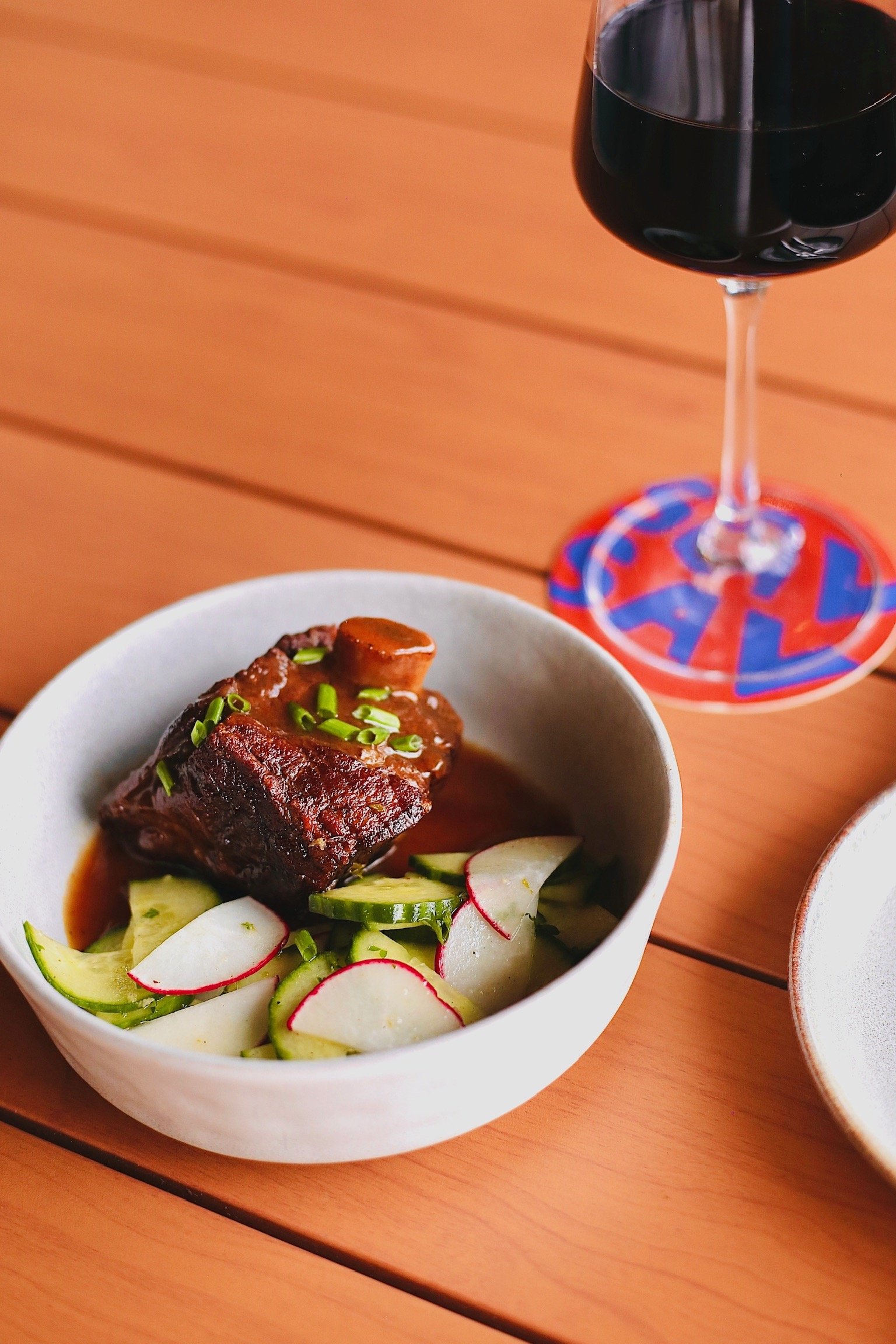 Entrée: Try the new Red Wine Braised Short Rib with ginger lime radish and cucumber salad. $28
