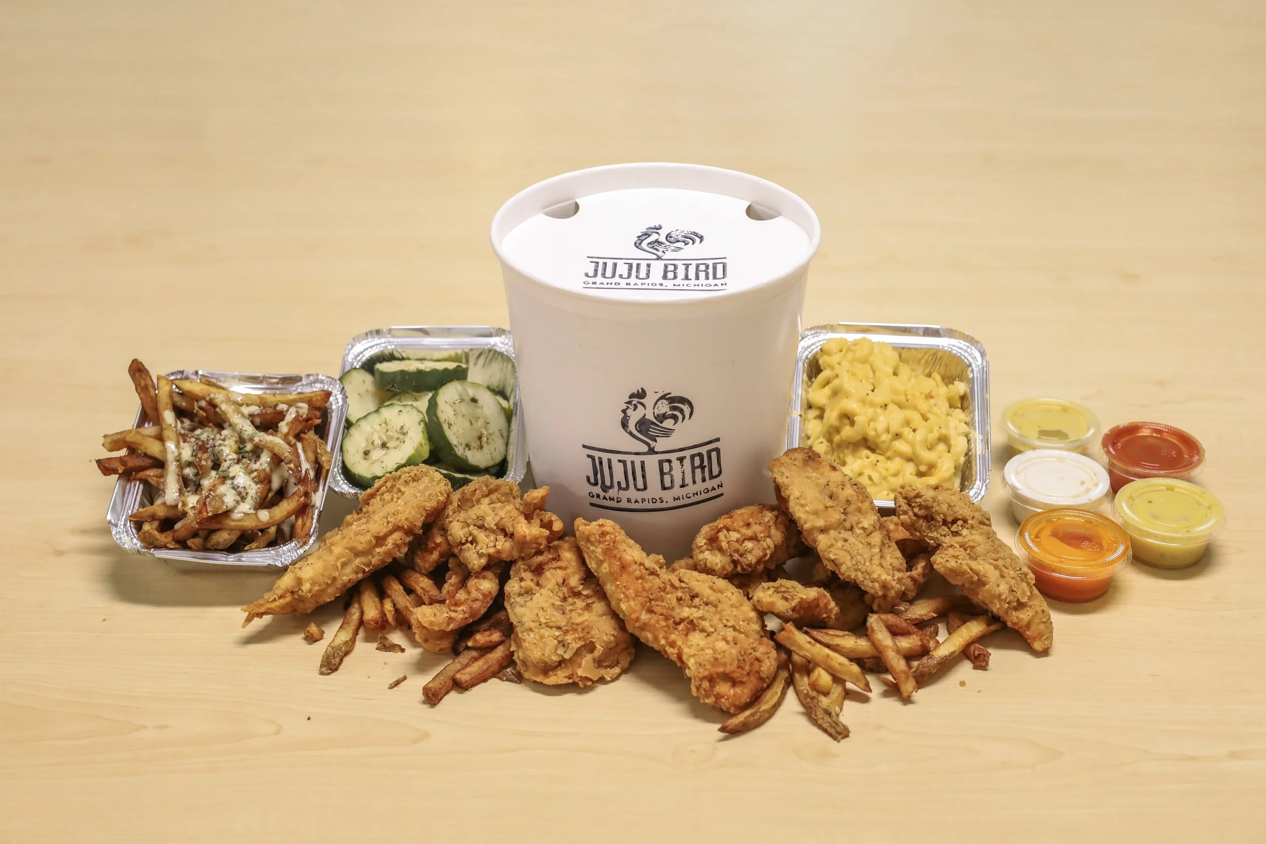 Nothing says party like a bucket of chicken! The Cluck-it Bucket from Juju bird is filled with strips or boneless wings, fries, sides, and sauces.