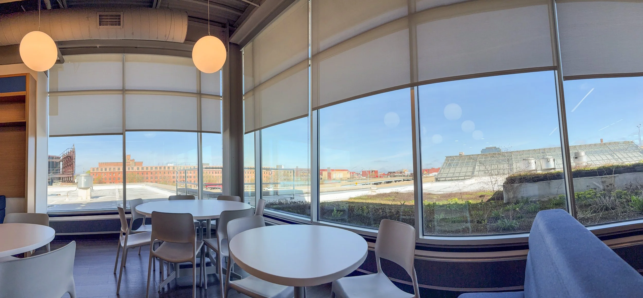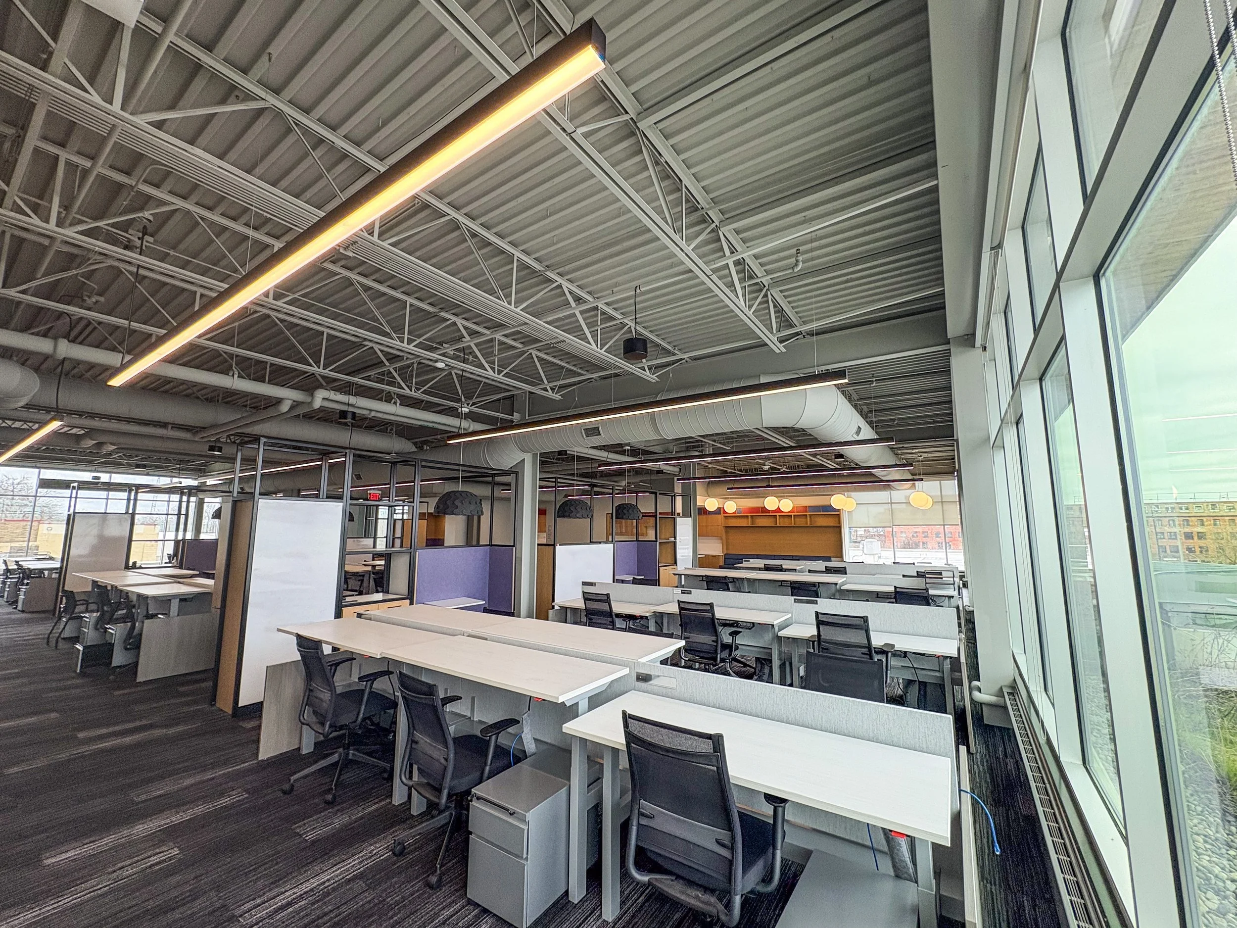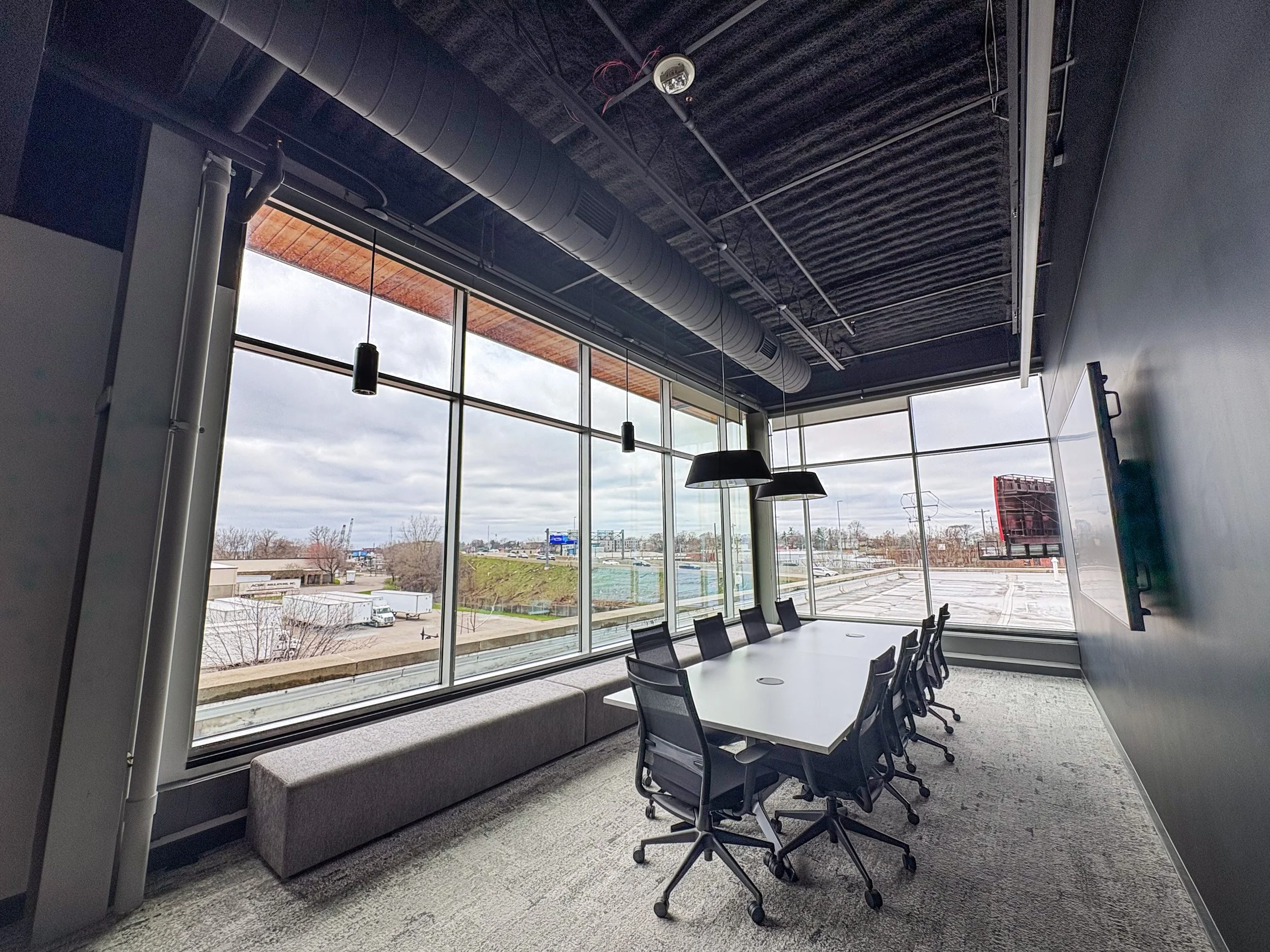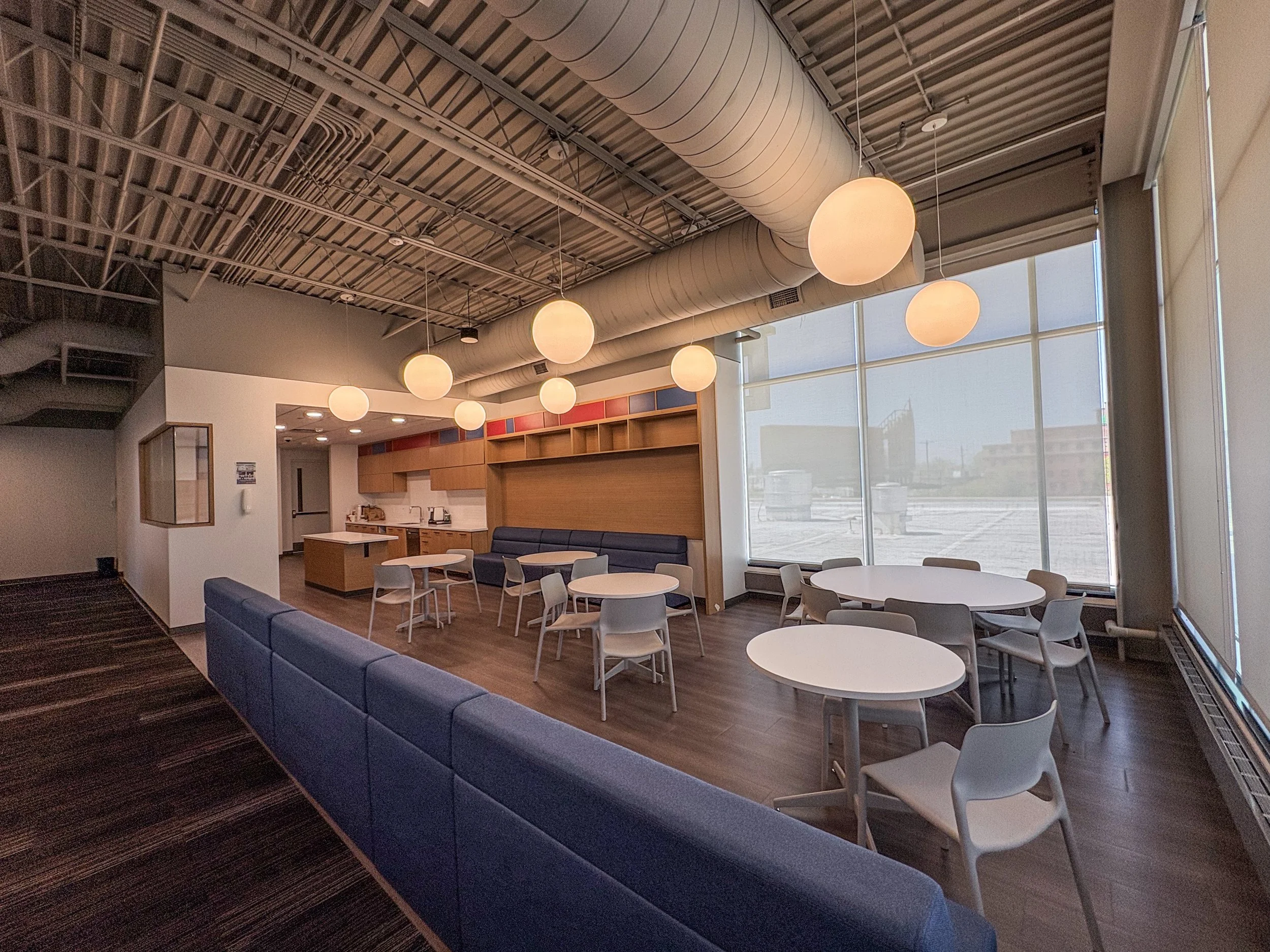 A fully-equipped kitchen designed for daily use, featuring two refrigerators, dishwasher, ample storage, and more. Adjacent, a light-filled dining and gathering space with floor-to-ceiling windows offers seating for 20+ and overlooks the downtown Grand Rapids skyline—ideal for team meals, informal meetings, and client hosting.
