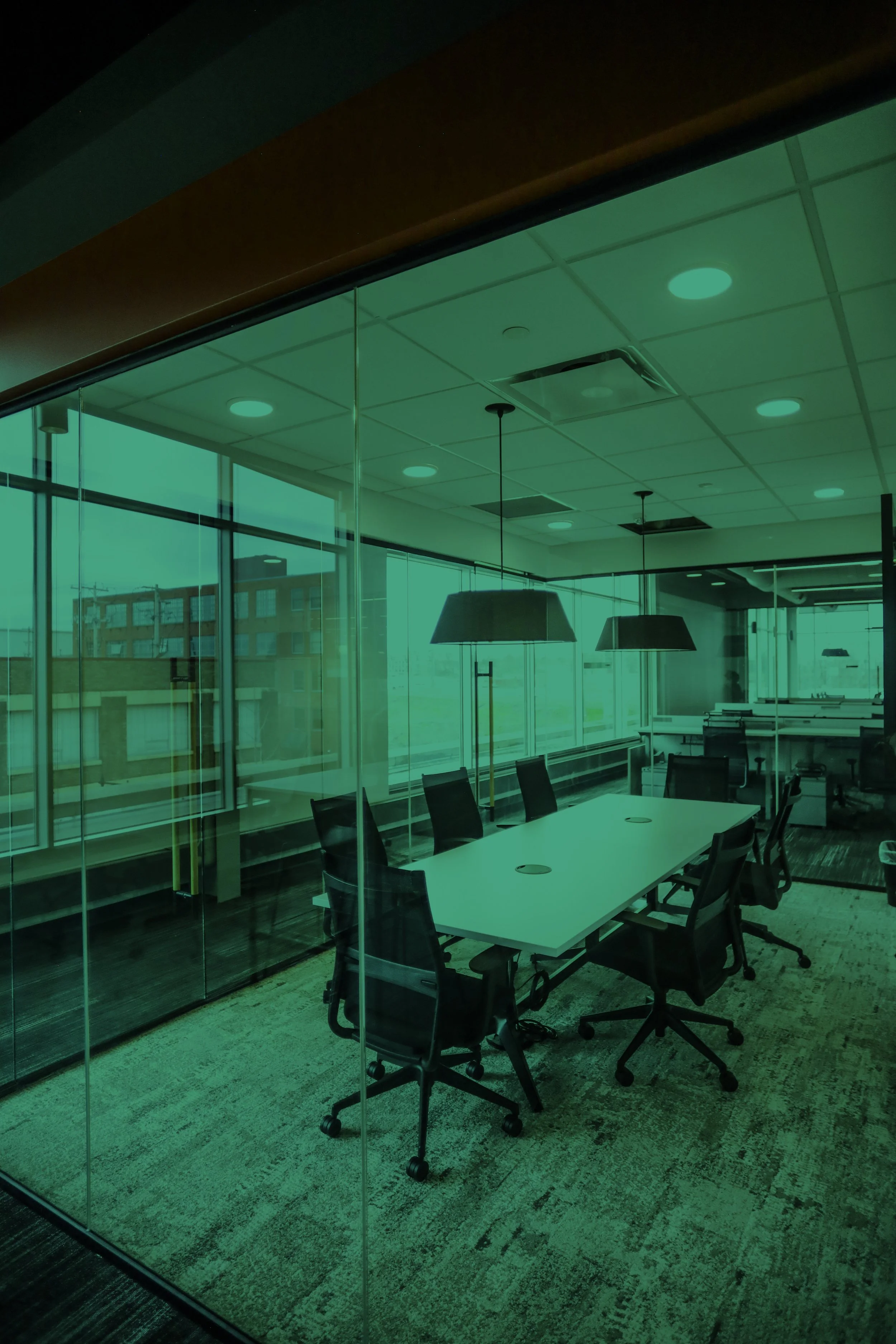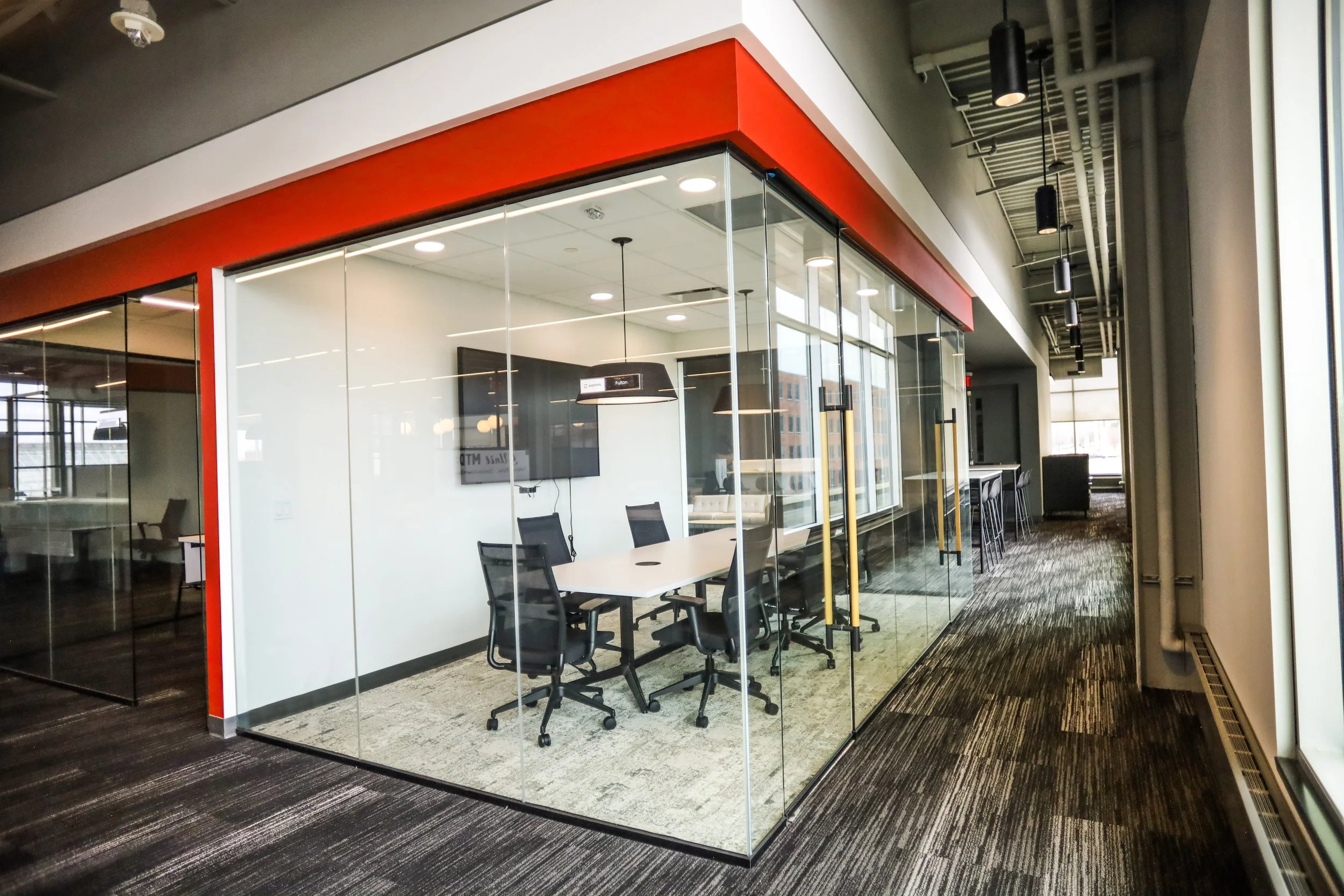 A centrally-located, glass-enclosed conference room featuring floor-to-ceiling windows and abundant natural light. Designed for groups of up to 14, it offers high-speed Wi-Fi and premium A/V capabilities ideal for meetings, presentations, and collaborative sessions.
