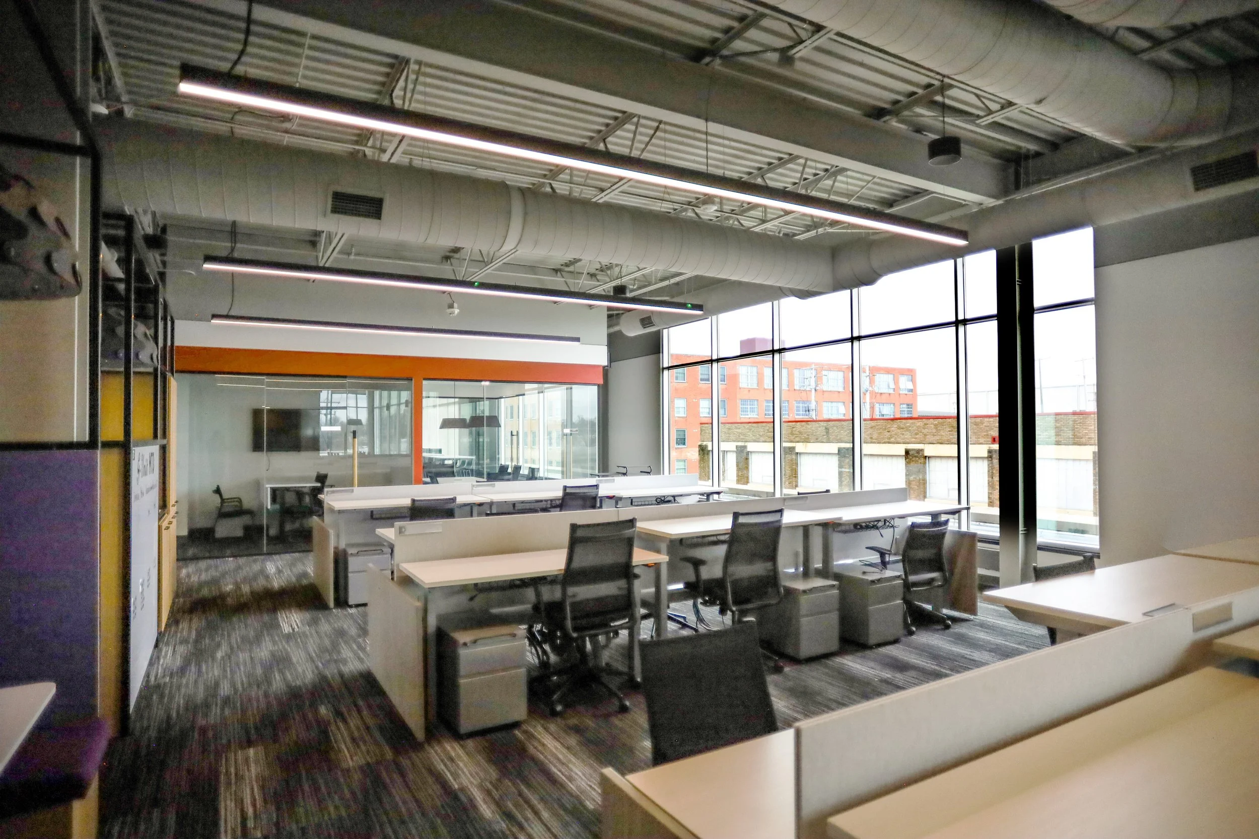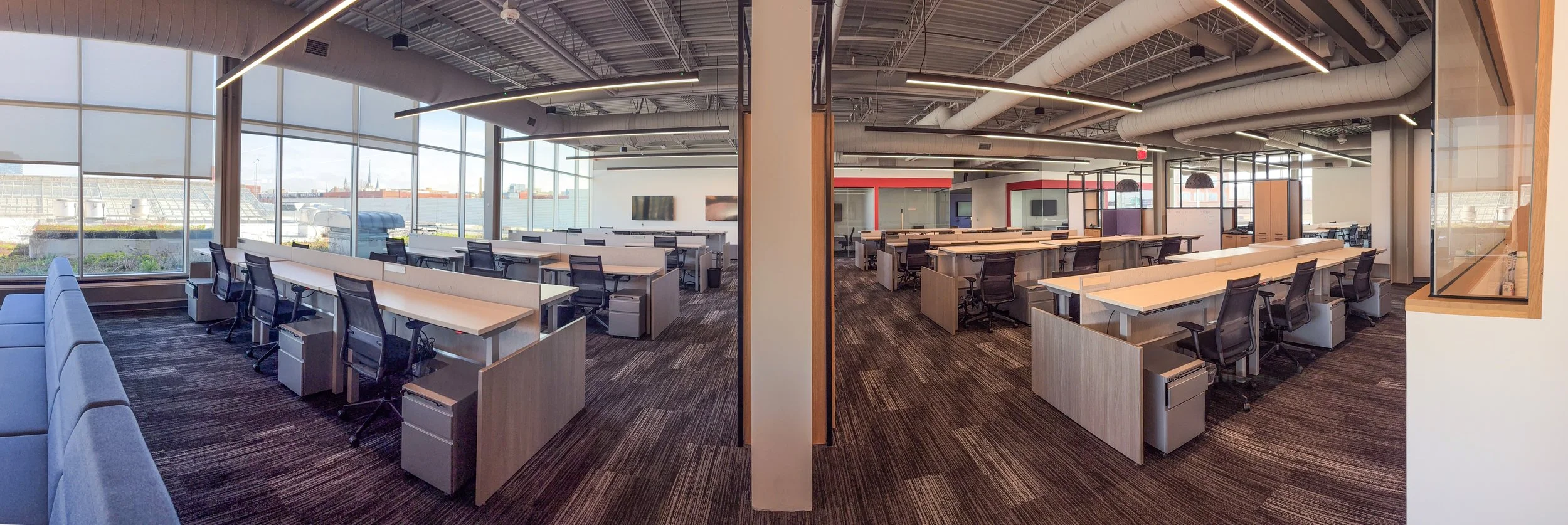 Five open-concept work areas designed to support 80+ workstations, fully-wired to meet connectivity and power needs. Each team member has a dedicated workspace, complete with a standing desk, while the overall layout encourages collaboration, flexibility, and team connectivity.