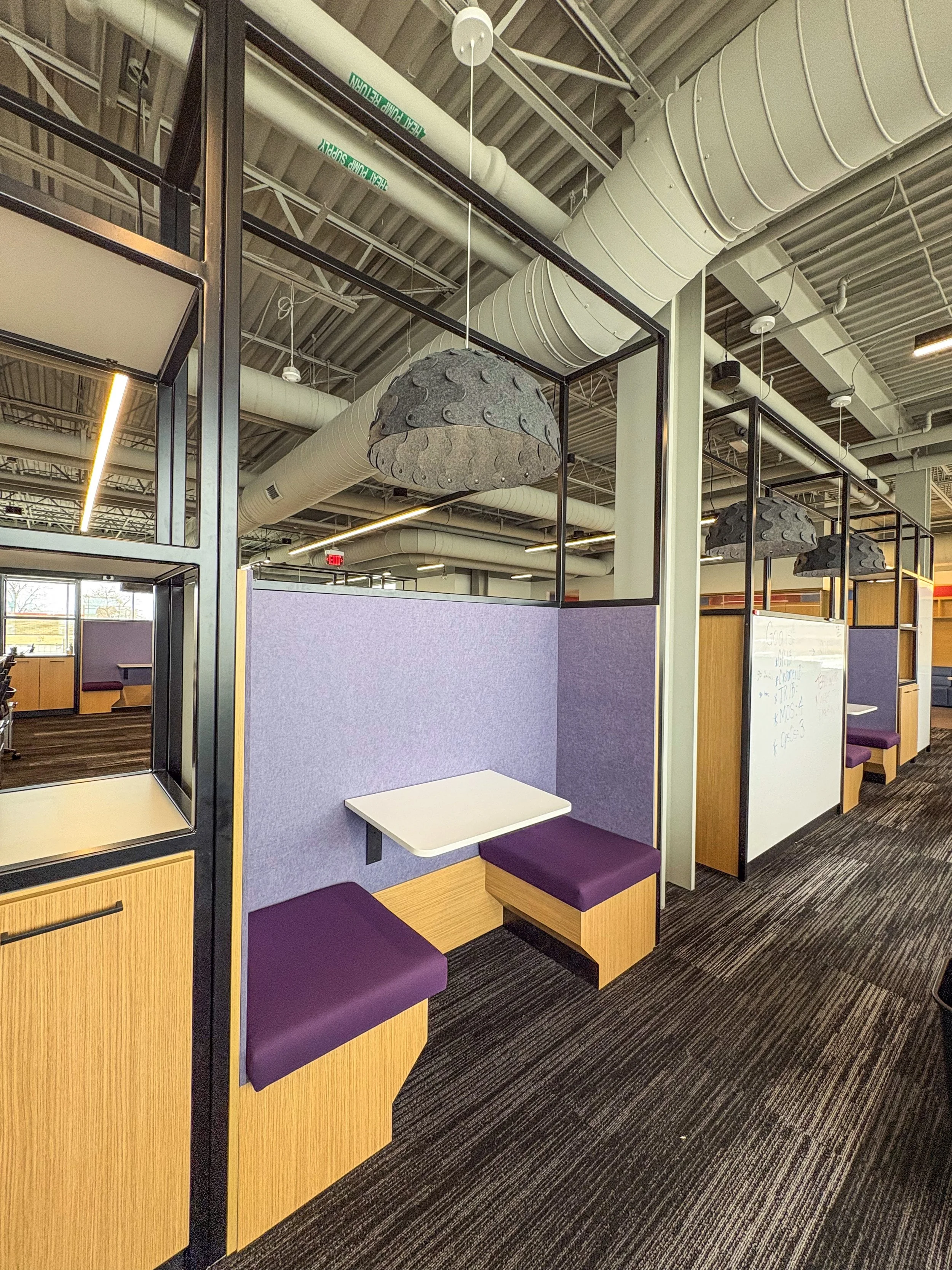 Three telephone booth-style individual workstations offer privacy for calls, virtual meetings, and heads-down tasks. Glass doors on each workstation facilitate a quiet environment without sacrificing connection to the team. Six restaurant-style booth seating areas provide comfortable spaces for one-on-one meetings or focused work.