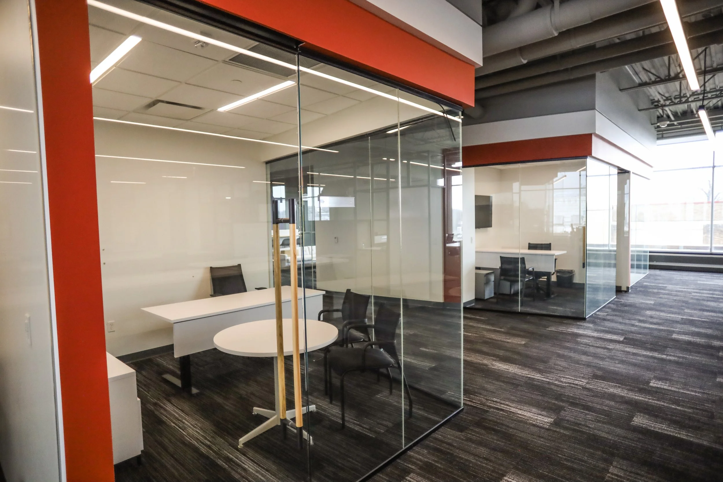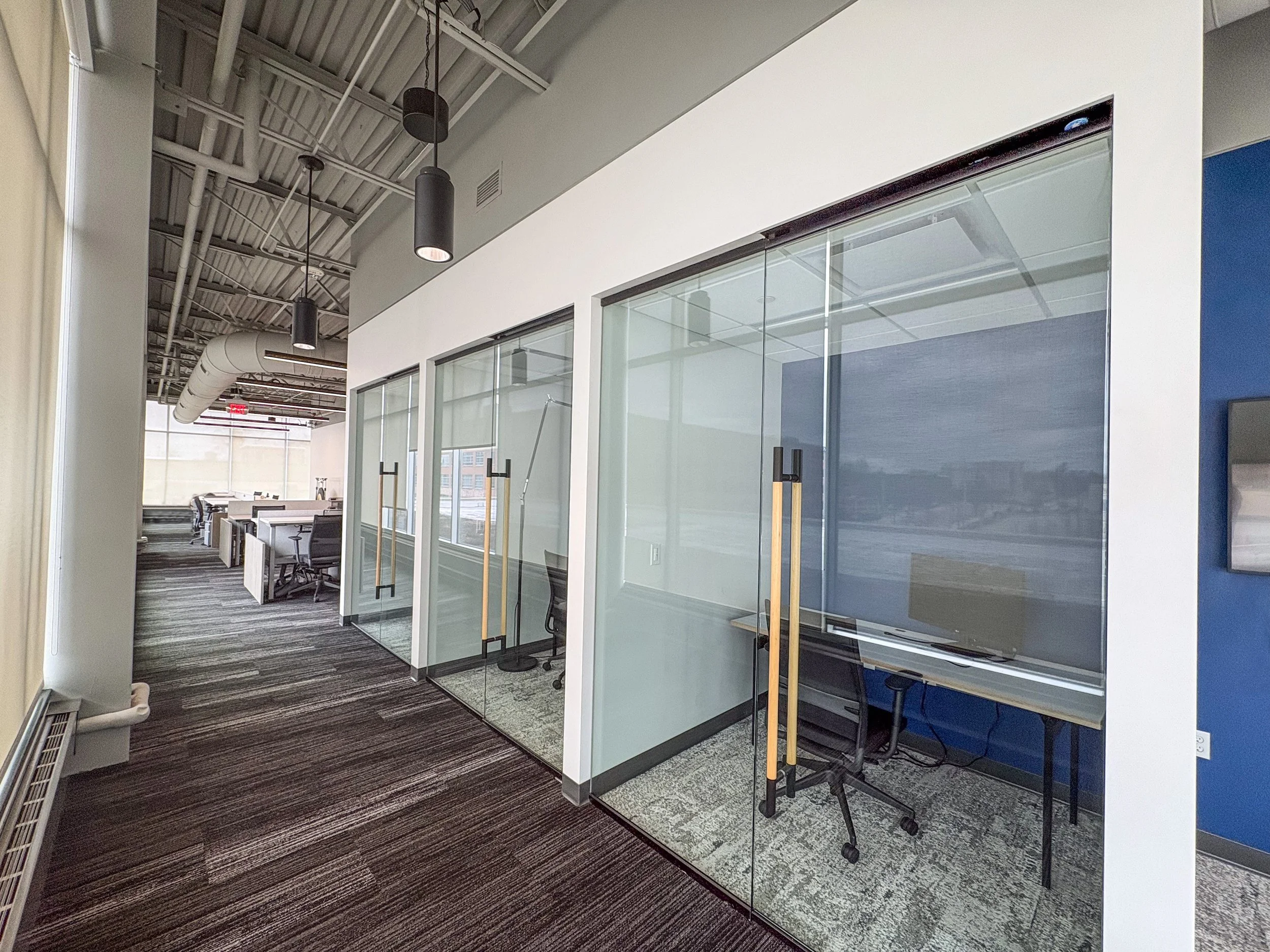 Three private executive offices feature floor-to-ceiling glass walls and doors, offering a refined balance of transparency and privacy. Designed for leadership that values both presence and focus, these offices allow you to remain visually connected to the broader workspace while having the ability to close the door for heads-down work and confidential conversations.