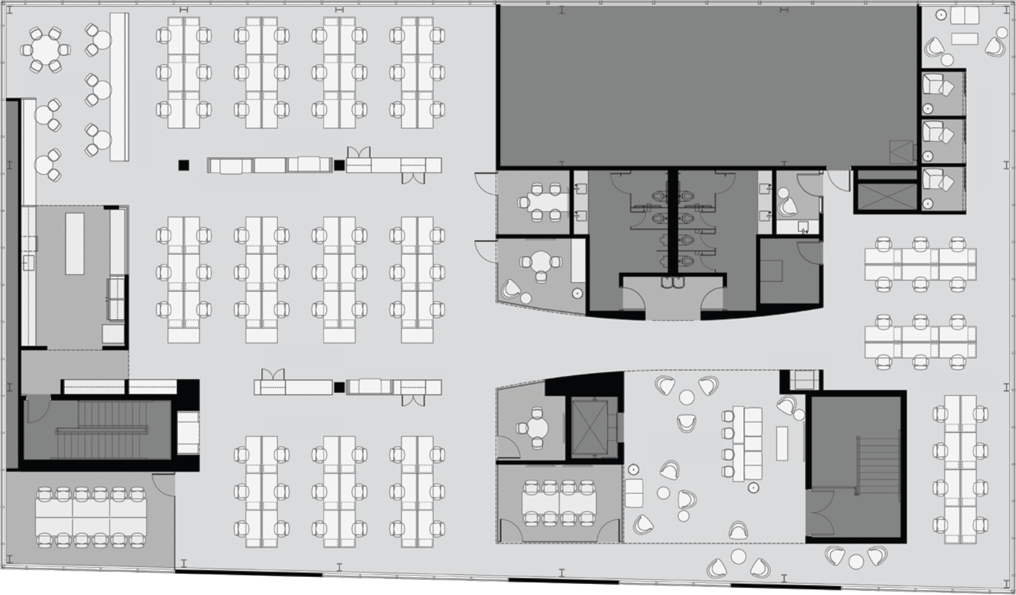 The overall flow of the floor plan layout promotes employee interconnectivity as well as diversity in workspaces—allowing each staff member to find a work style that benefits the task at hand.