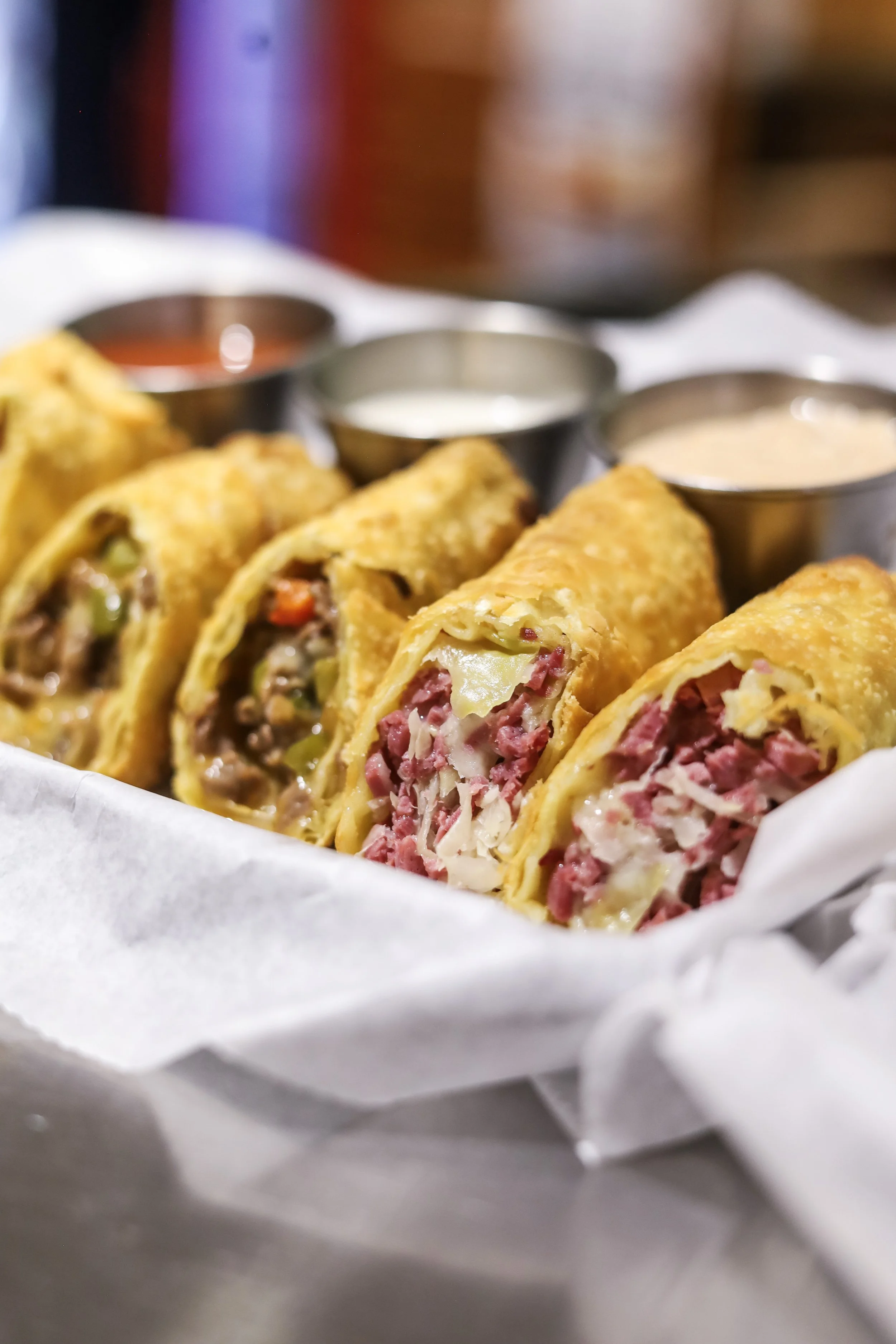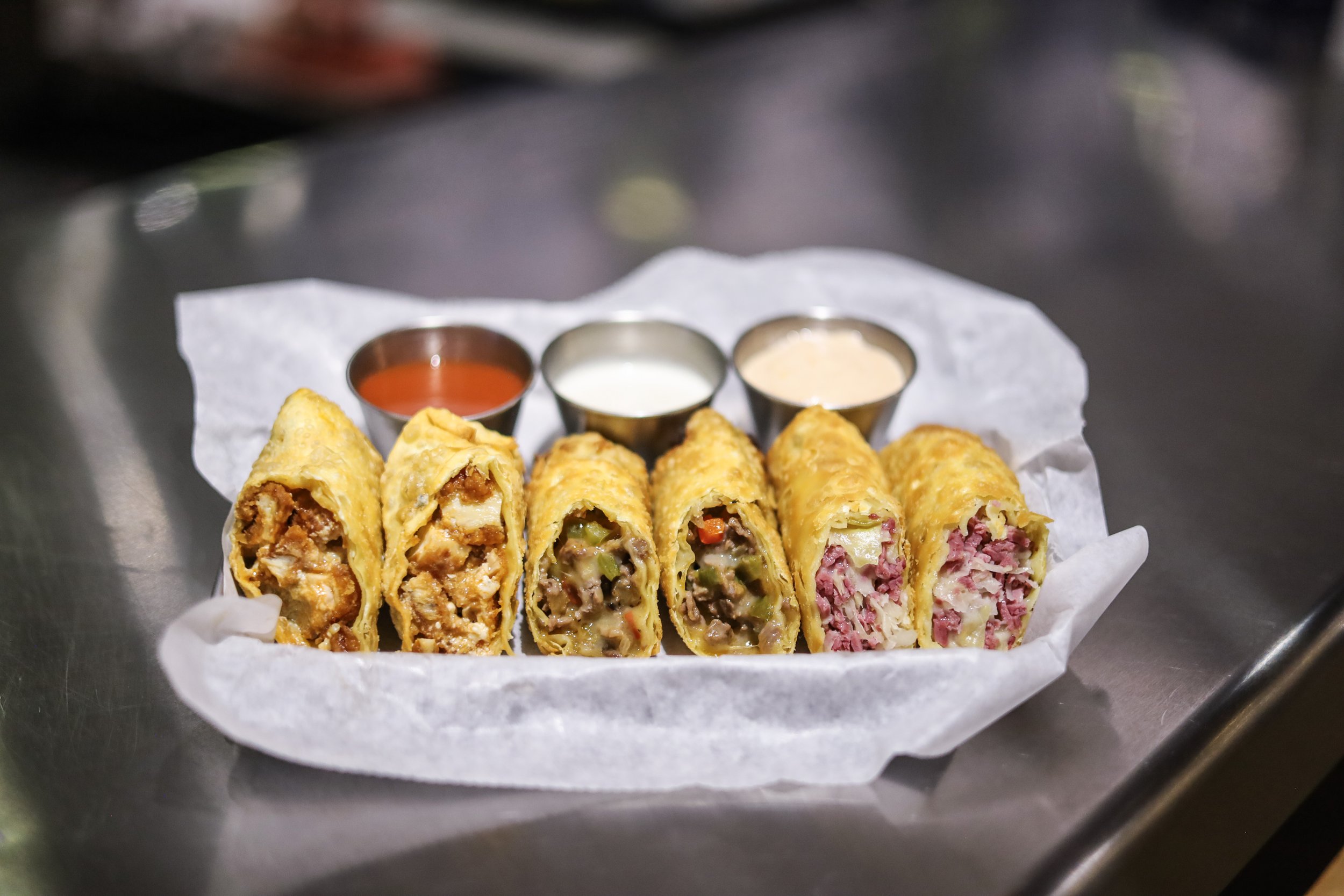 A trio of house-made egg rolls with philly, reuben, and buffalo chicken filling.