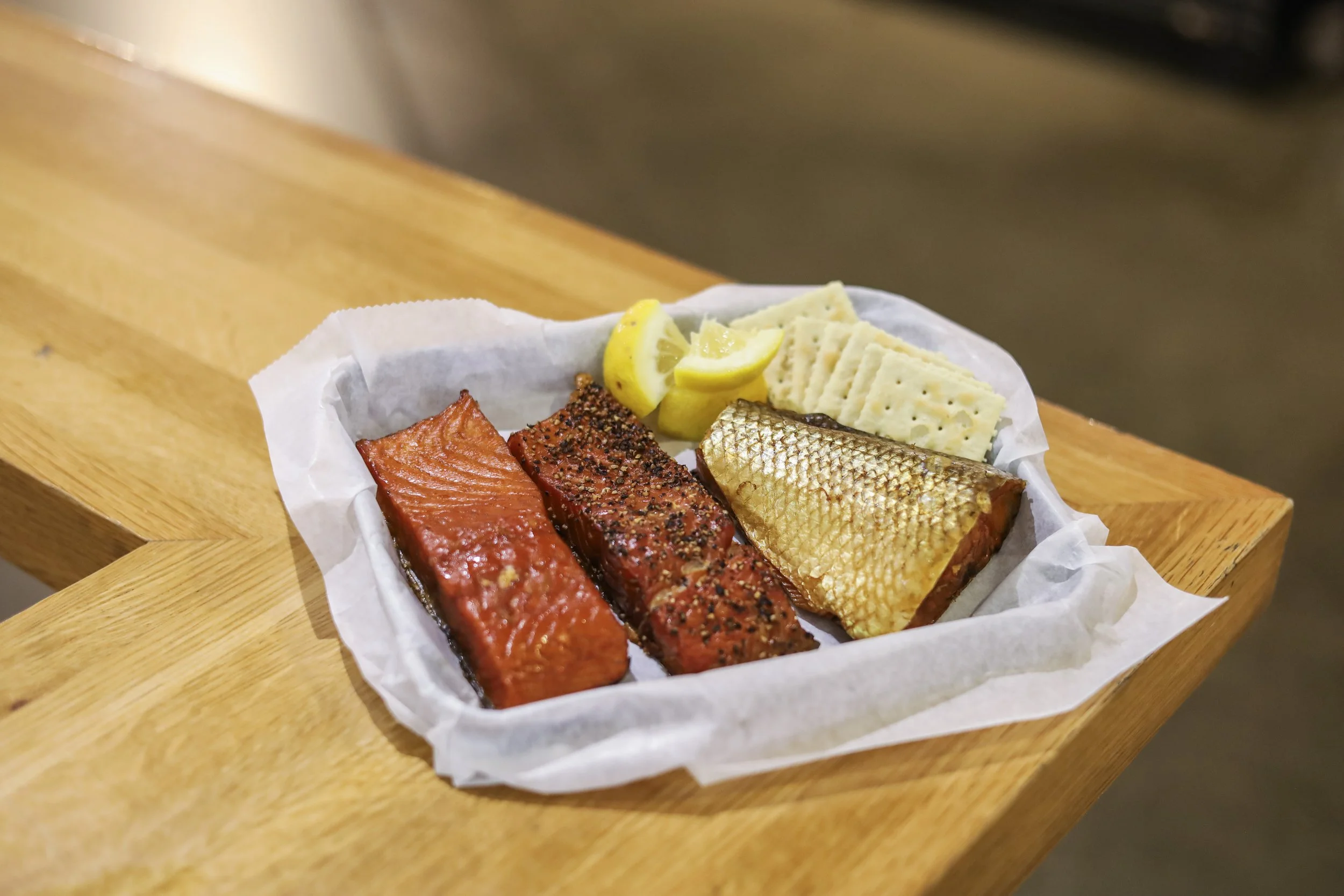 A platter featuring three pieces of smoked fish: traditional smoked salmon, black pepper smoked salmon, and smoked whitefish.