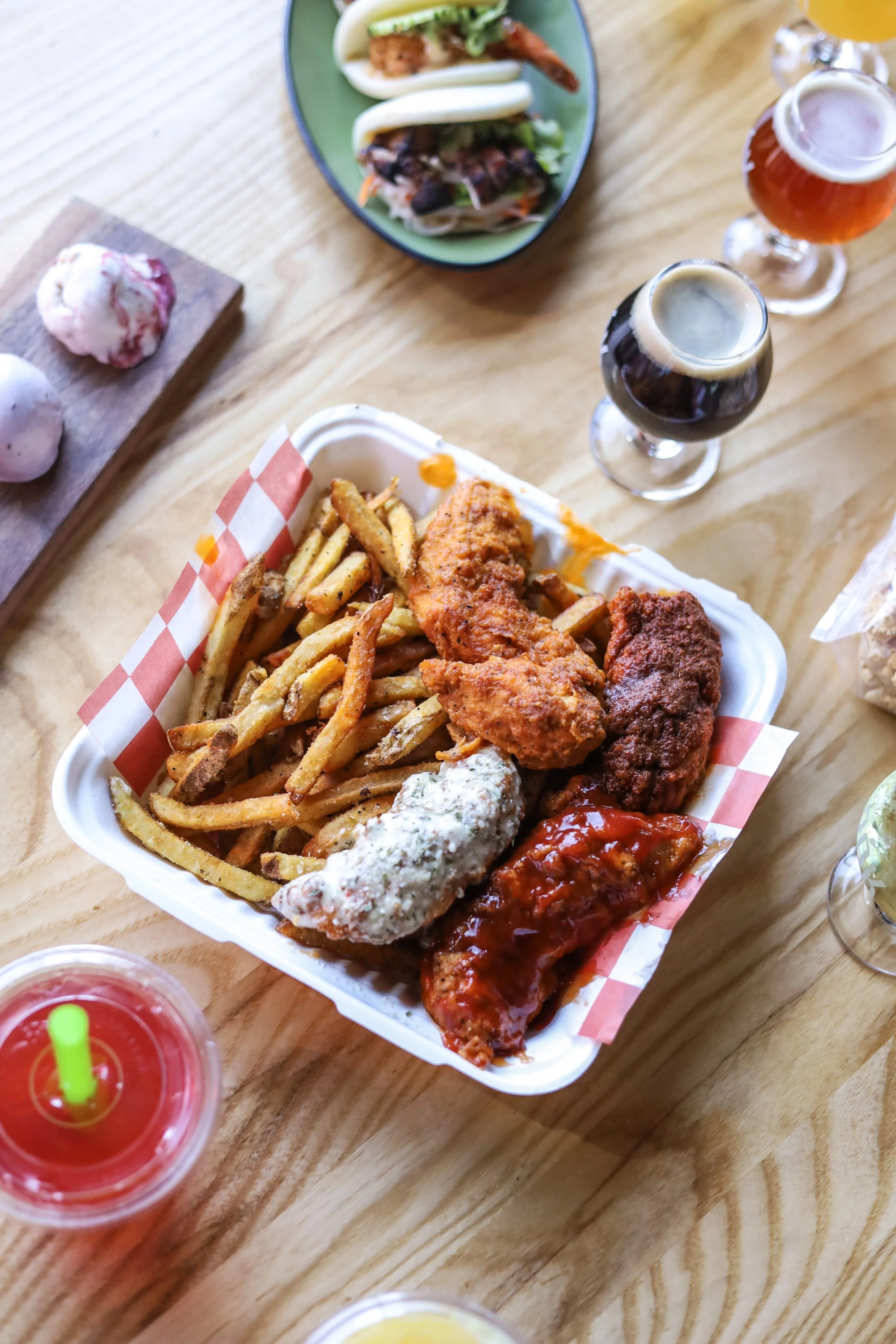 Four chicken strips each dipped in sauces of your choice, served with fries. Mix, match, and customize your strips with buffalo, garlic parm, BBQ, and more! $15