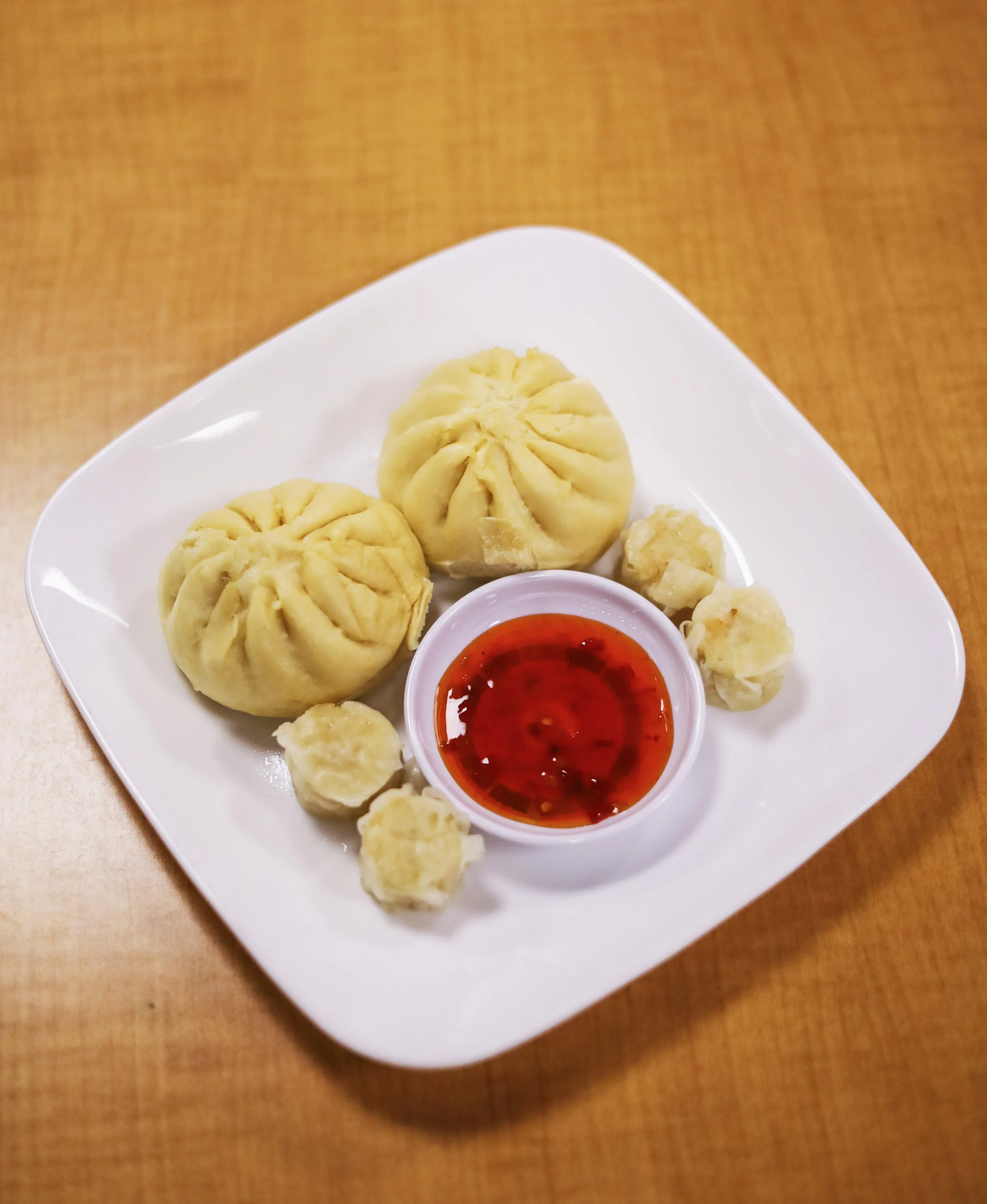 One BBQ pork bao, one teriyaki chicken bao, and four shrimp shumai with sweet chili dipping sauce. $10