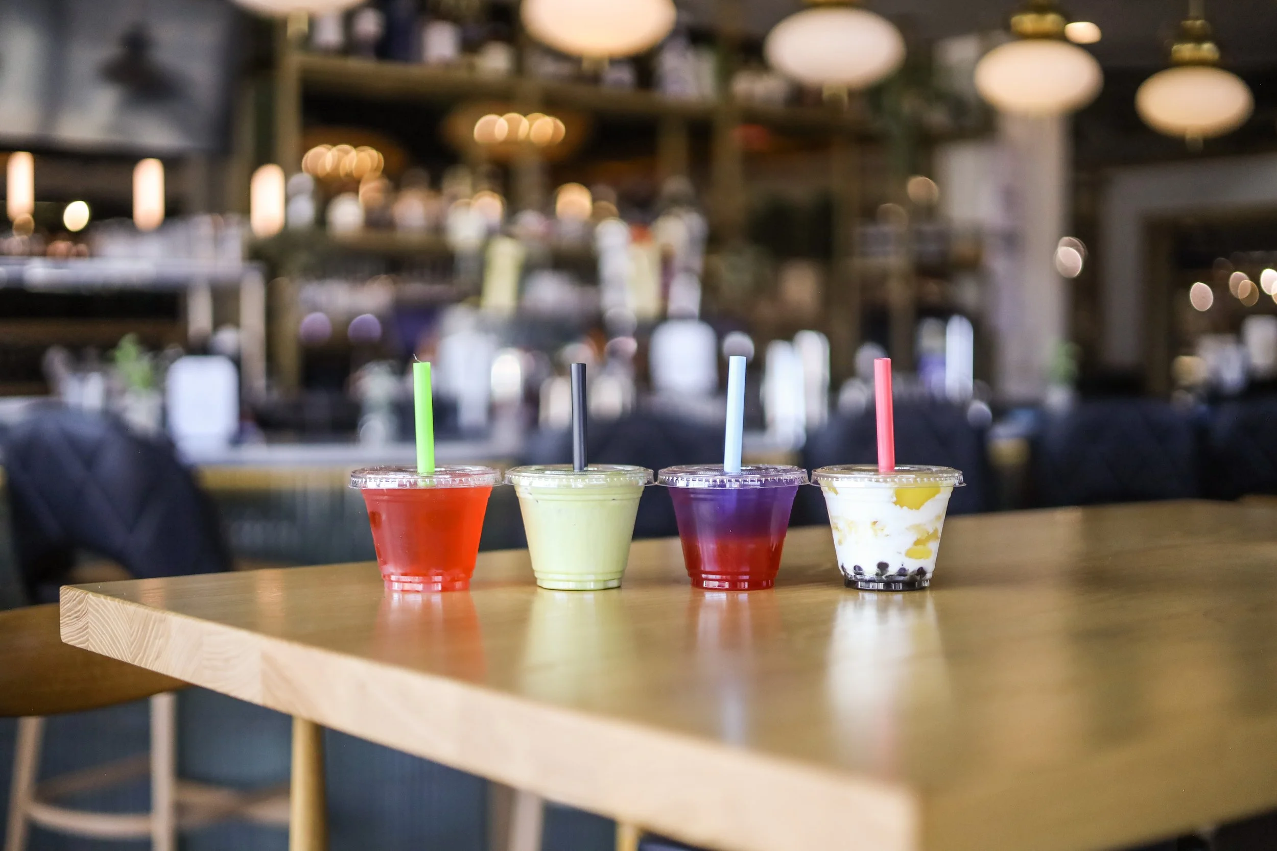 Four 9oz boba teas in different flavors and combinations: lychee rose fruit tea with lychee jellies, orange creamsicle milk tea with tapioca pearls, coconut matcha cloud foam, and berry refresher with strawberry popping pearls. $16