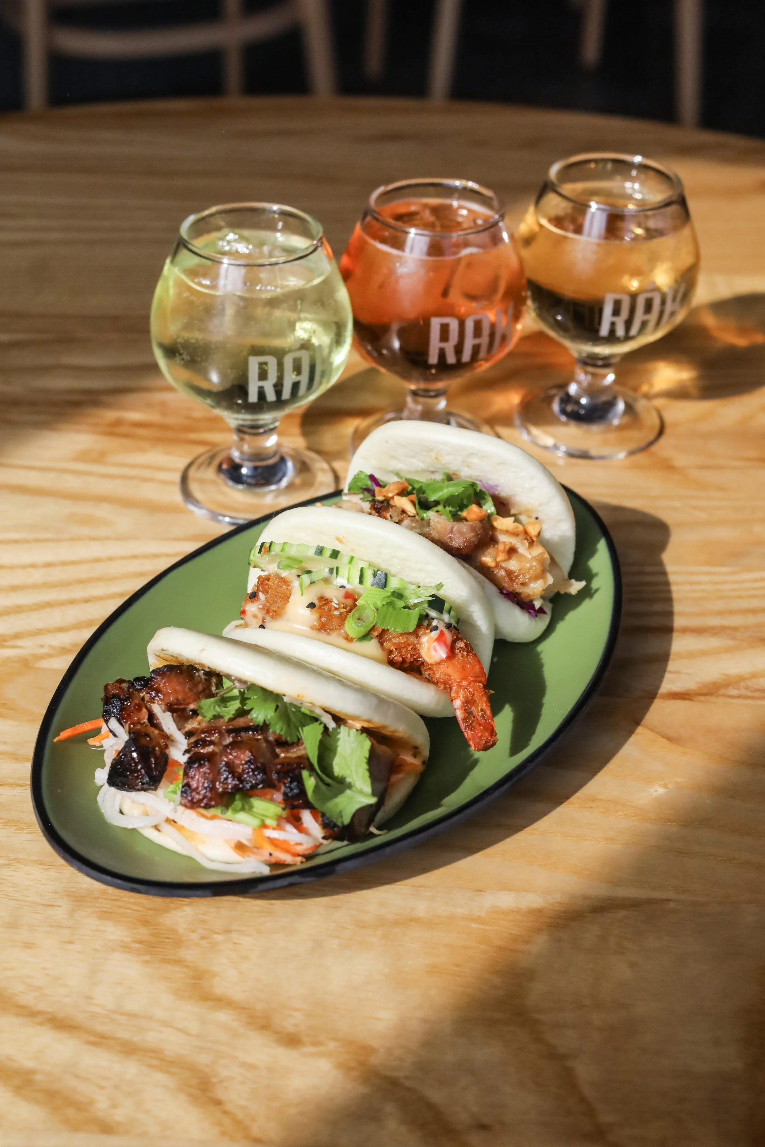 Three soft steamed bao buns stuffed with lemongrass pork, tamarind chicken, and bang bang shrimp. $15
