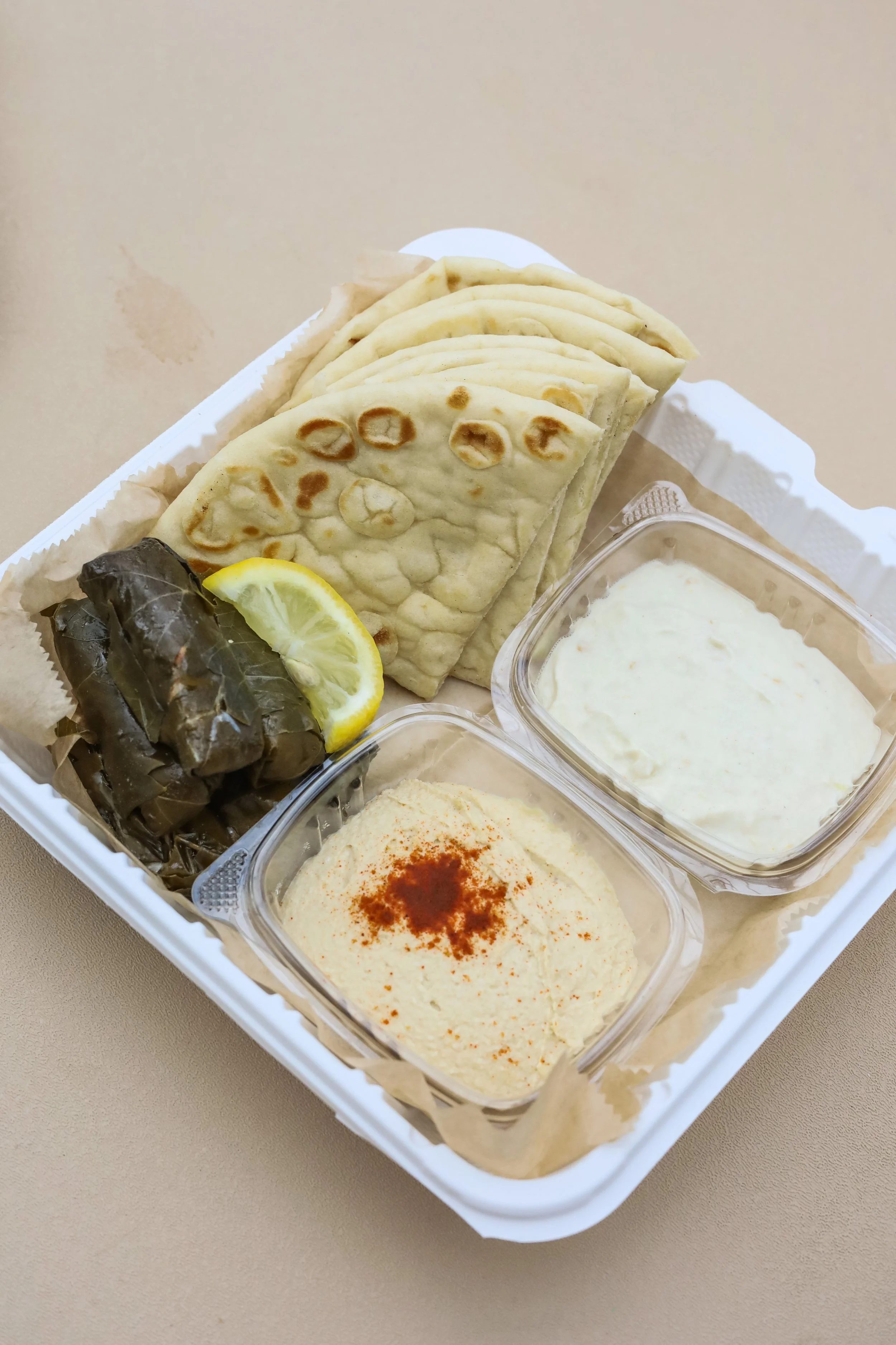 A shareable Mediterranean spread of hummus, baba ghanoush, and grape leaves, served with warm pita. $9.95