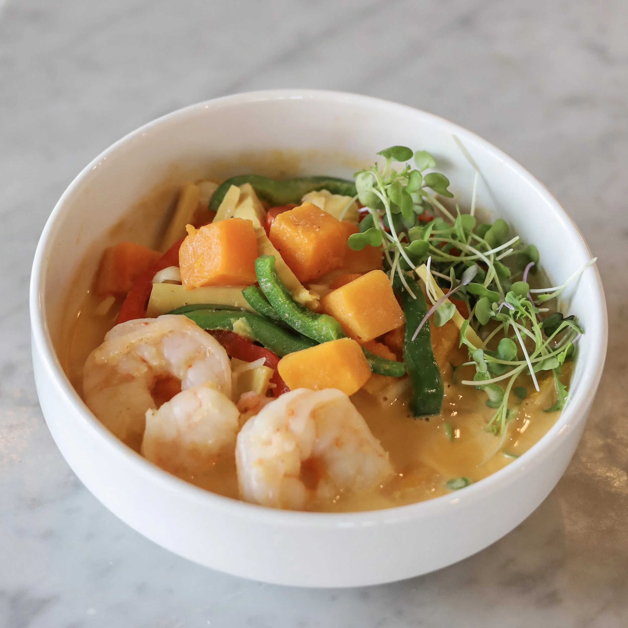 Butternut squash, bell peppers, bamboo, and mushrooms all wok-tossed in red curry sauce with the protein of your choice: chicken, steamed tofu or veggies. $16